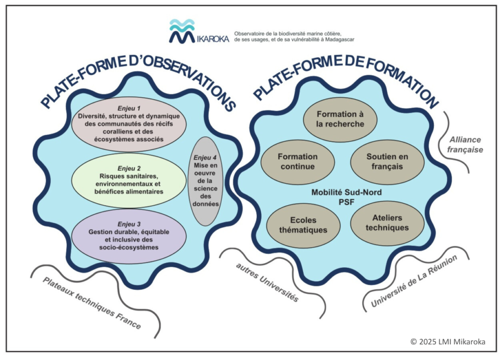Soutenu par l’Institut de Recherche pour le Développement (IRD), le Laboratoire Mixte International (LMI) Mikaroka « Observatoire de la biodiversité marine côtière, de ses usages et de sa vulnérabilité à Madagascar » a pour objectif principal de développer des recherches répondant aux enjeux concernant la biodiversité, la conservation des habitats côtiers et la gestion durable, équitable et inclusive des ressources marines de ce pays. Co-construit entre trois partenaires à Madagascar et trois partenaires en France, cette phase 2 du LMI (2025-2029) a pour ambition de répondre aux attentes de la société civile [ONG, associations] et des pouvoirs publics, et de former de jeunes scientifiques de haut niveau.